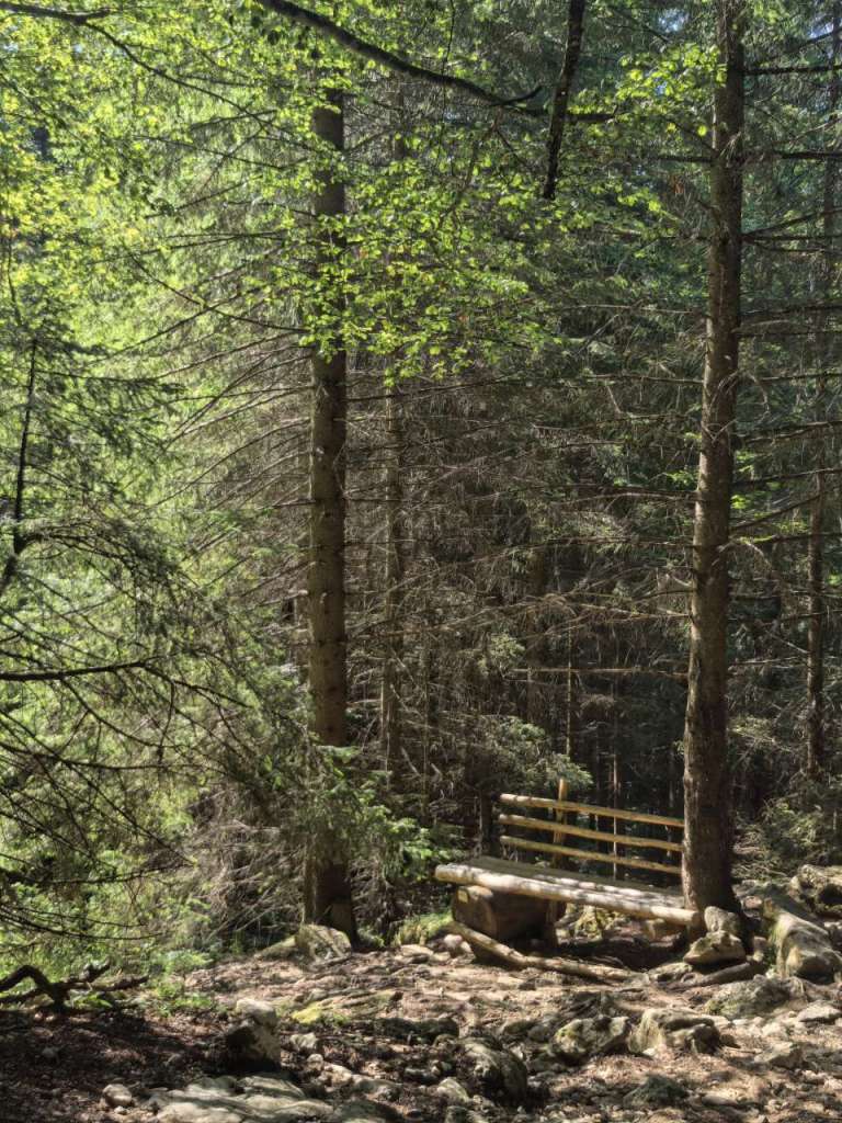 Mai lung acest drum familiar, dar cu o pantă domoală, o adevărată plăcere pentru genunchii noștri. Adevărată plimbare prin pădure, printr-o altă pădure de fapt, parcă nu la fel de sălbatică și de sinistră, bonus băncuțe amenajate pentru hodina drumeților, pe care nu le-am lăsat nefolosite, era păcat de truda oamenilor care le-au meșterit.