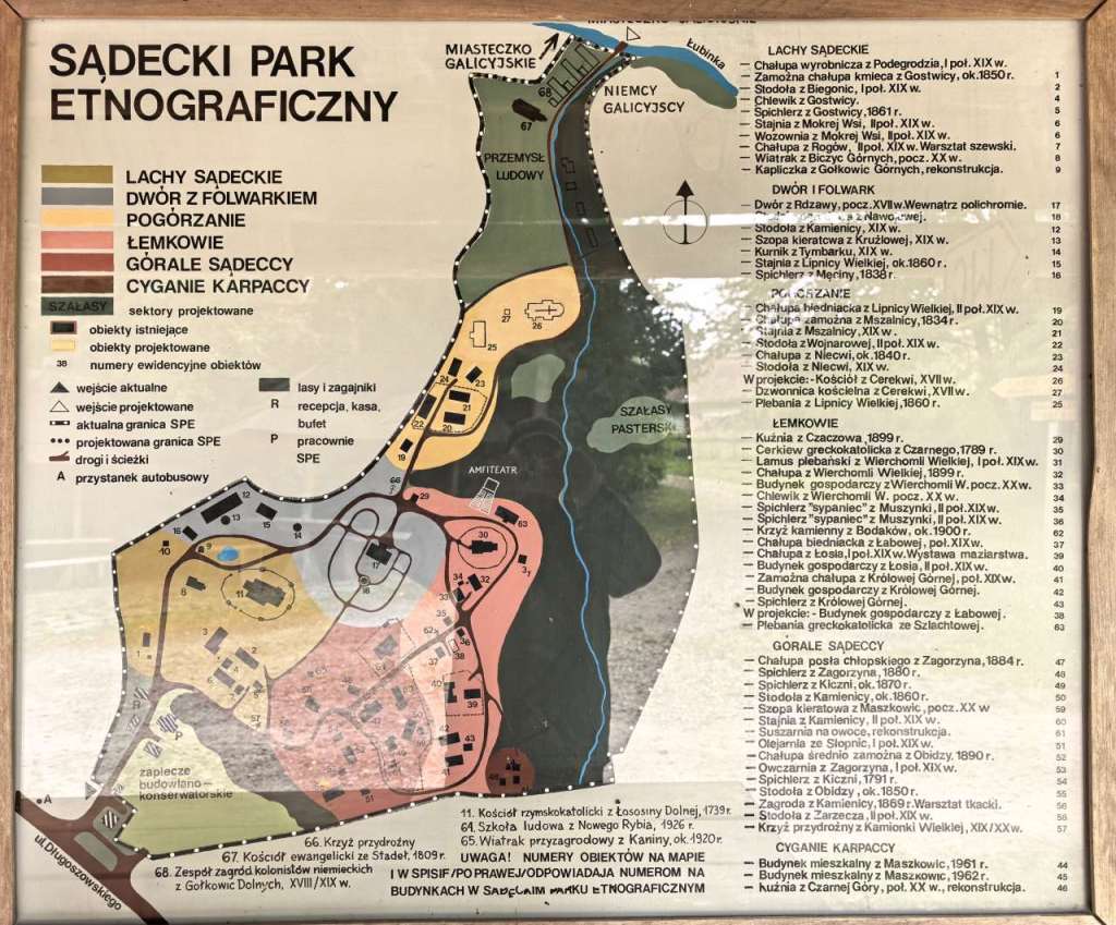 Parcul Etnografic Sadecki ocupă o suprafață de 20 de hectare, pe un deal cu pășuni înverzite, cu pâlcuri de pădure, și prezintă nu mai puțin de 70 de gospodării și case – ferme țărănești, o casă nobiliară din secolul al XVII-lea cu o policromie interioară pe lemn unică, cum n-am mai văzut, dar și biserici din secolul al XVIII-lea: romano-catolică, greco-catolică și protestantă.