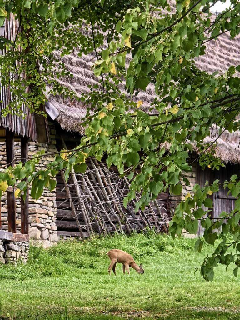 Plătit biletele, luat la pas ulițele înverzite și, după numai câțiva zeci de pași am zărit un pui de căprioară ce păștea liniștit în curtea uneia dintre gospodăriile muzeului.