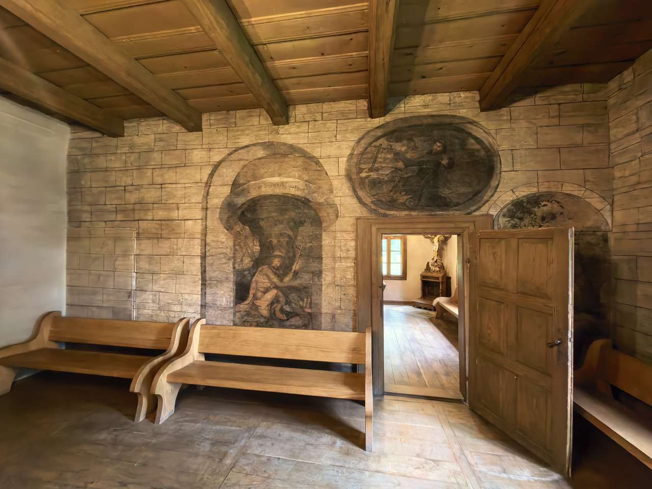 În camere, tavanele și pereții sunt decorați cu desene realizate direct pe tencuială, precum și cu „cuverturi” și mici tapiserii pictate tot pe hârtie. Camerele sunt, de asemenea, decorate cu obiecte din hârtie creponată colorată. Normal că și bucătăriile, precum și cuptoarele tradiționale, nu au rămas nedecorate în aceeași manieră și stil.