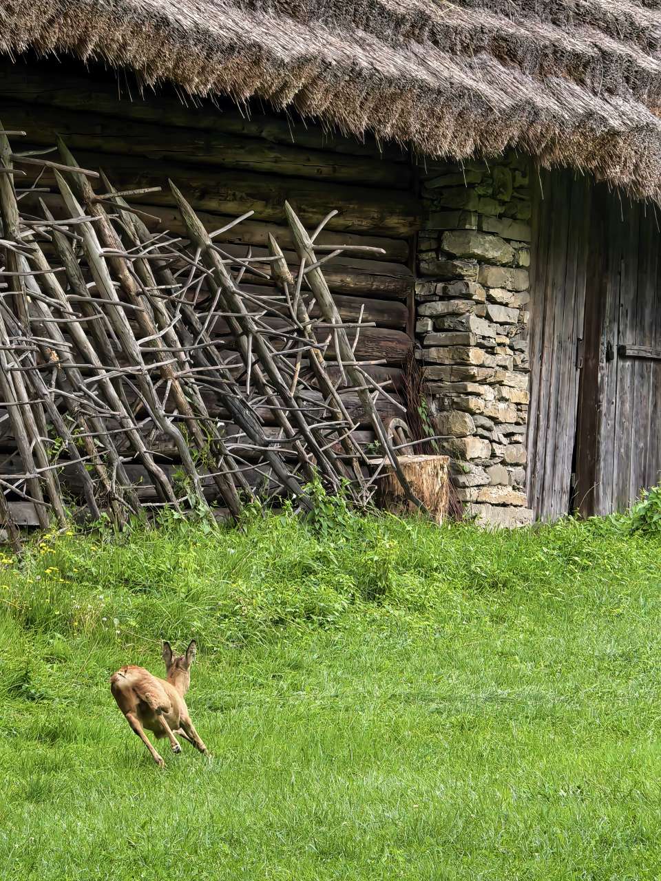 Plătit biletele, luat la pas ulițele înverzite și, după numai câțiva zeci de pași am zărit un pui de căprioară ce păștea liniștit în curtea uneia dintre gospodăriile muzeului.