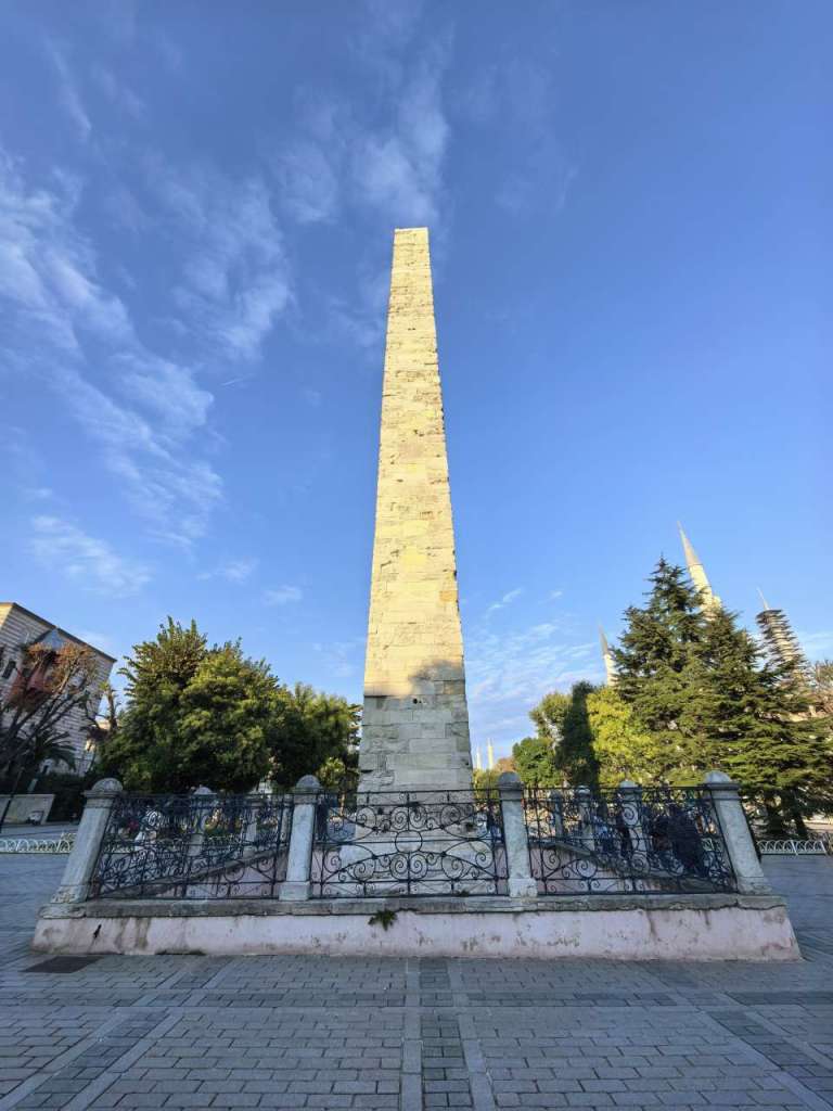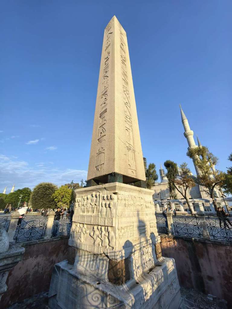 Obeliscul lui Teodosie, este unul egiptean. A fost ridicat în Karnak de către faraonul Tutmes al III – lea (care a domnit cu un mileniu înainte) și adus la Constantinopol în anul 390 d.Hr. de împăratul Teodosie I. Baza sa este decorată cu basoreliefuri care îl înfățișează pe împărat și familia sa asistând la cursele de care din Hipodrom.