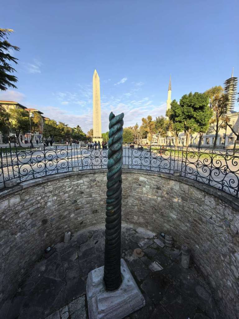 Deși nu mai este întreagă rămâne la fel de impresionantă, mai ales dacă știi că bronzul din care este realizată a fost forjat din armele perșilor învinși în bătălia de la Plateea (479 î.Hr.). Doar un cap de șarpe mai există acum, se află expus la Muzeul Arheologic din Istanbul, adică la câțiva pași mai încolo.