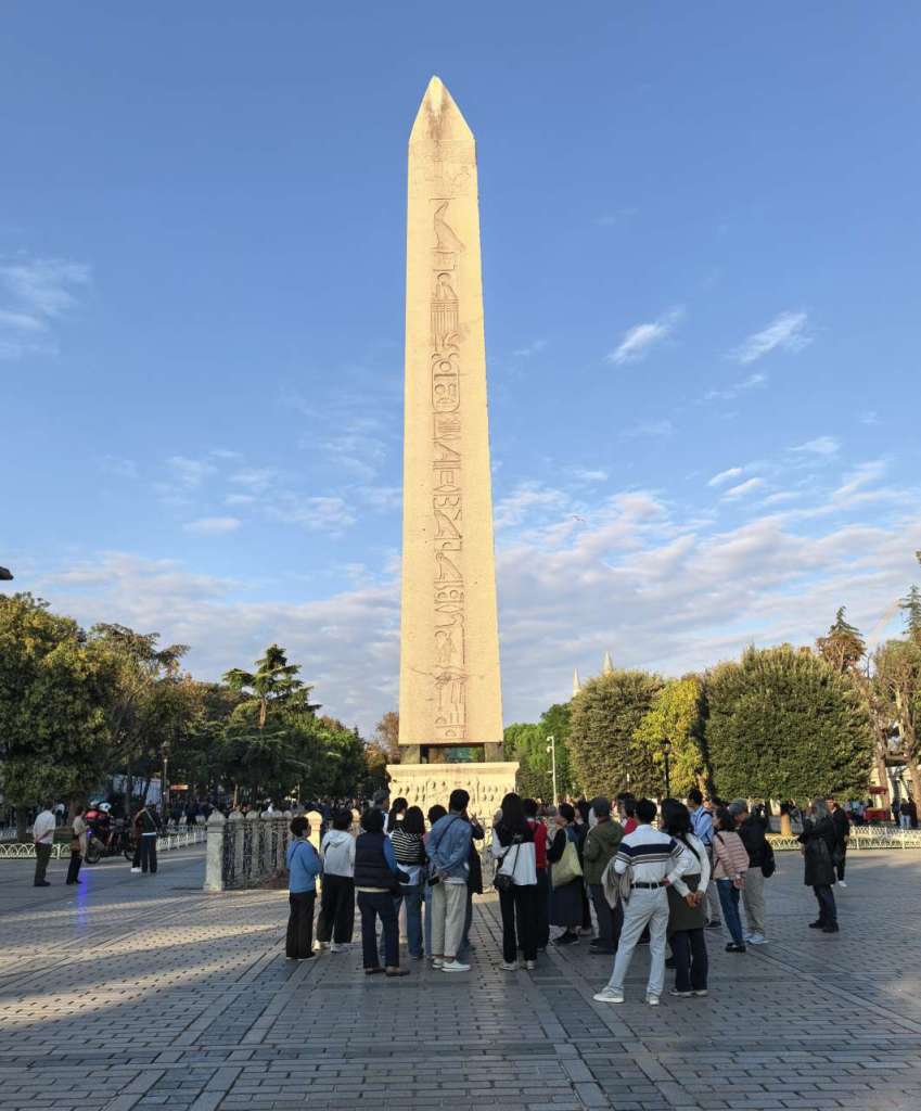 În fața moscheii sunt trei vestigii istorice importante ale Istanbulului, rămase din vremurile celorlalte imperii care au sălășluit aici.