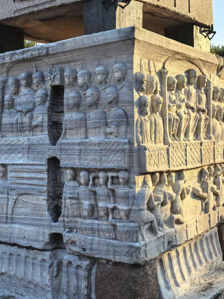 Coloana șerpilor, trei șerpi împletiți care simbolizează unitatea orașelor grecești. Origine în Grecia antică (secolul V î.Hr), a fost adusă de Constantin cel Mare în secolul IV d.Hr. și amplasată în centrul Hipodromului. Unul dintre multe alte monumente din tot imperiul, ce au fost mutate pentru a decora noua sa capitală.