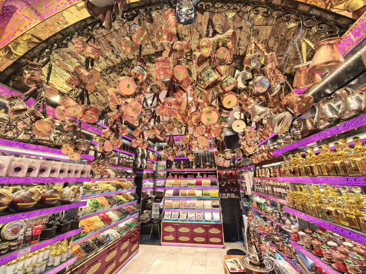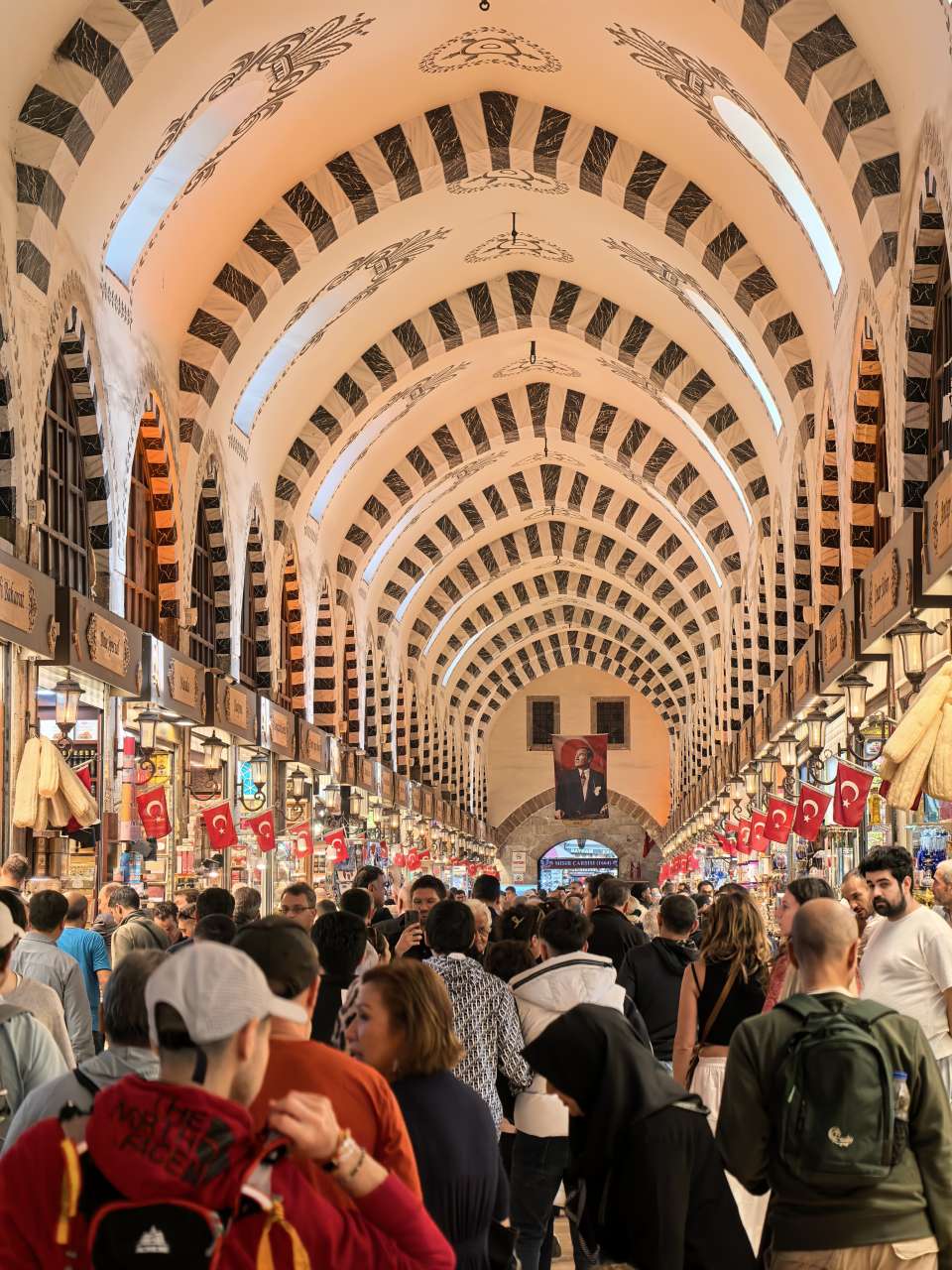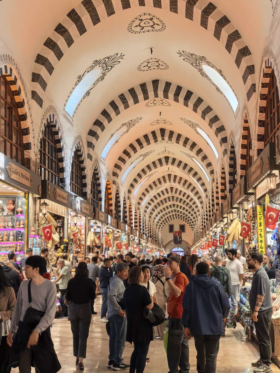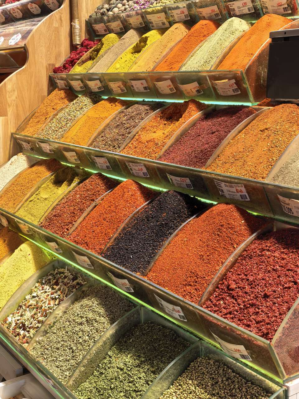 Apoi am intrat pe una dintre porțile arcuite ale bazarului, am trecut prin controlul de securitate și m-a lovit instant mirosul de mirodenii, care m-a învăluit din toate părțile. Aer parfumat de toate mirodeniile pământului, scorțișoară, chimen, șofran, ceaiuri în tot felul de combinații, din petale de trandafiri, de iasomie, rodie ba chiar și după rețete speciale pentru kamasutra, cafea proaspăt măcinată, esențe de parfum, baclavale și rahat, fructe și semințe uscate, fistic și curmale, smochine și nuci, caise, lavandă, așezate piramidal sau în cutii generoase.