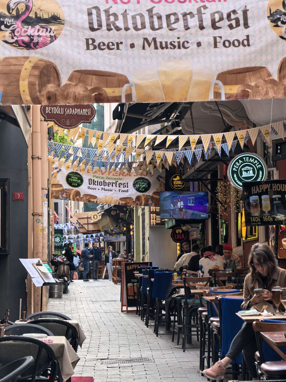 Cu scurte opriri pe la muzee, am bătut strada Istiklal dintr-un capăt în celălalt, de la Turnul Galata și până în Piața Taksim, ba chiar am luat la pas și străzile adiacente, strâmte și ticsite de cafenele, restaurante, baruri și berării, unele cu ditamai panourile cu Oktoberfest, nah de vezi întâmplare pentru amatorul de bere din mine. Oktoberfest în Istanbul… Bună idee.