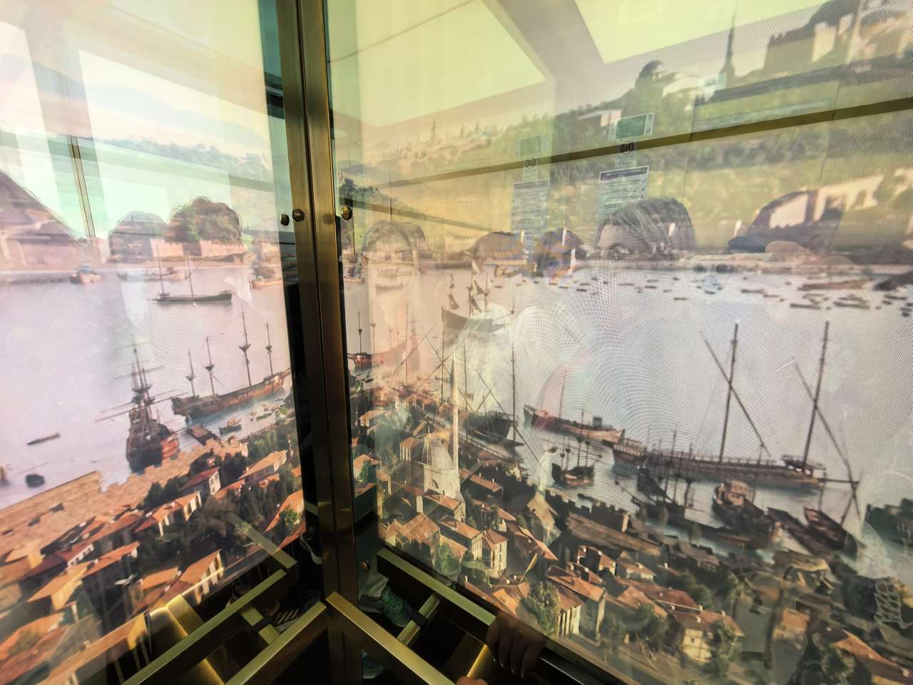 Ajunși la baza Turnului Galata, ne-am așezat frumușel la coadă și în numai 20 de minute, eram deja în liftul cu ecrane ce arată imagini istorice de jur-împrejur, ca un preambul al vederilor panoramice exterioare cu Istanbulul actual și de care te poți bucura de pe platforma în aer liber a acestuia.