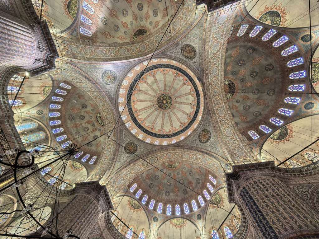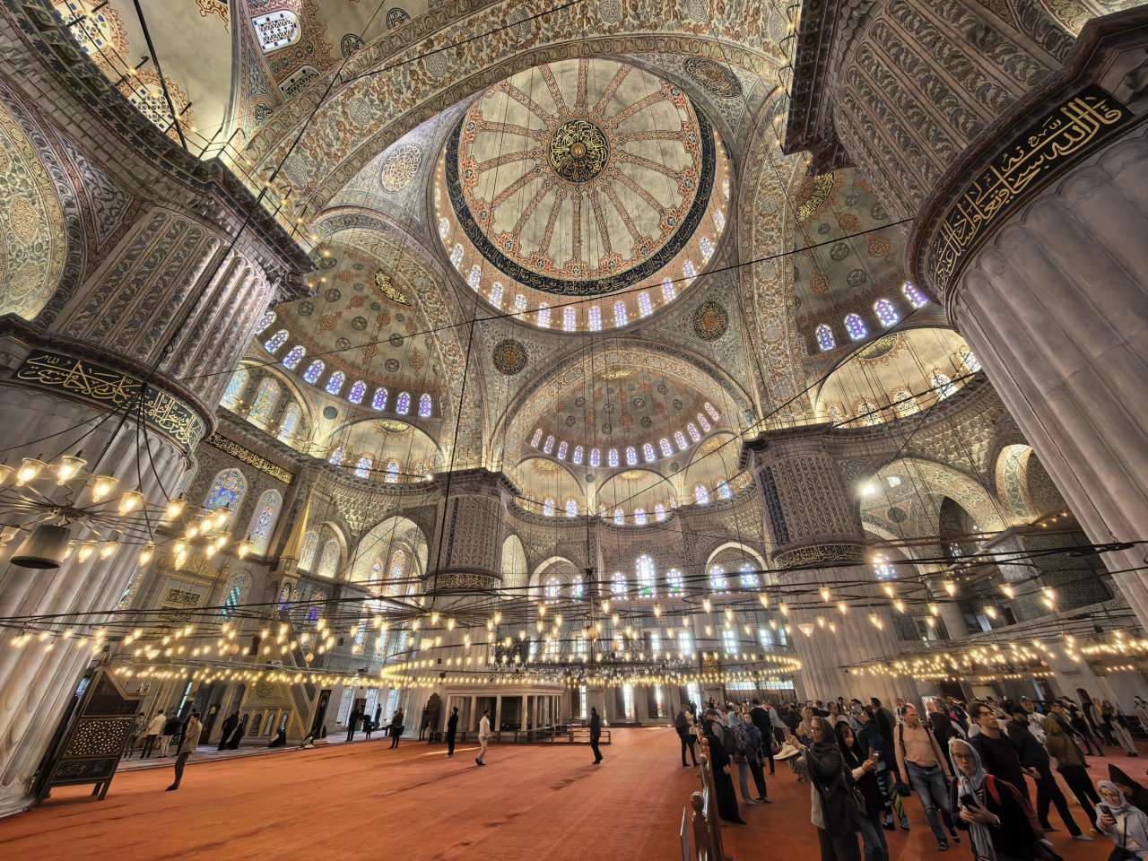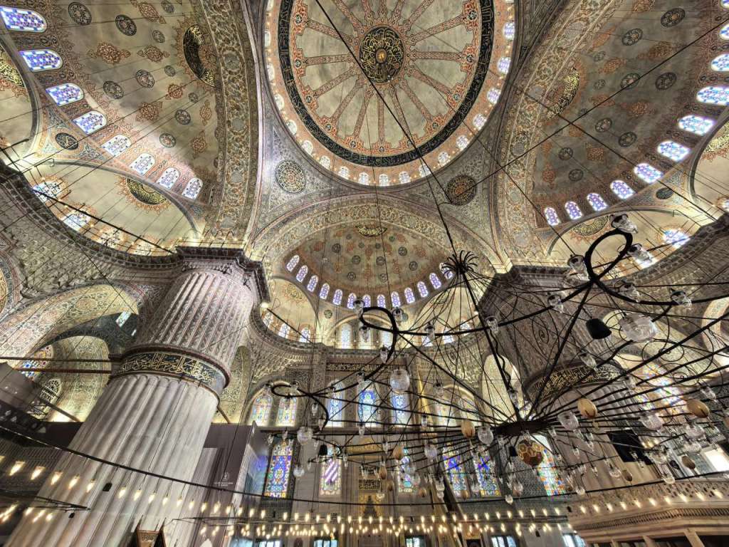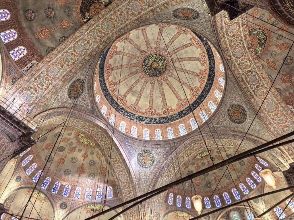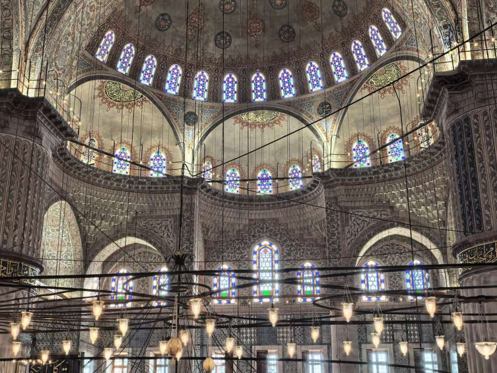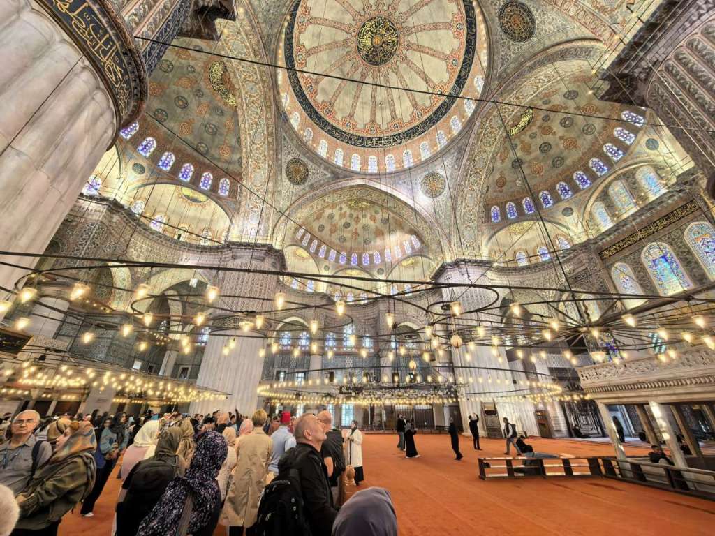 Toată agitația și zumzetul de afară au dispărut ca prin farmec, deși aglomerația stăruia la interior, cel puțin în zona turistică accesibilă. Am pășit pe covoarele groase și moi, desculț, și am privit la coloanele masive, la candelabrele suspendate care coborau foarte aproape de planul podelei, dar destul de sus încât să nu-i deranjeze pe eventualii baschetbaliști ce ar fi intrat acolo, la superbele decorațiuni care încântă pe oricine, din orice cultă religioasă ar face parte, lalele, garoafe și arabescuri în nuanțe de cobalt, turcoaz, albastru și de alb, de o finețe de nedescris.