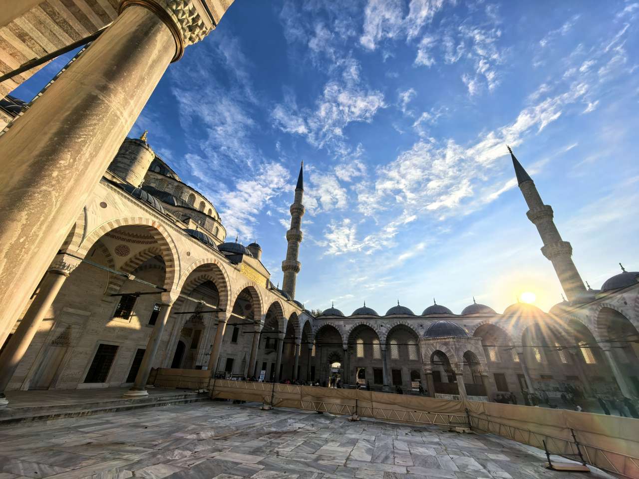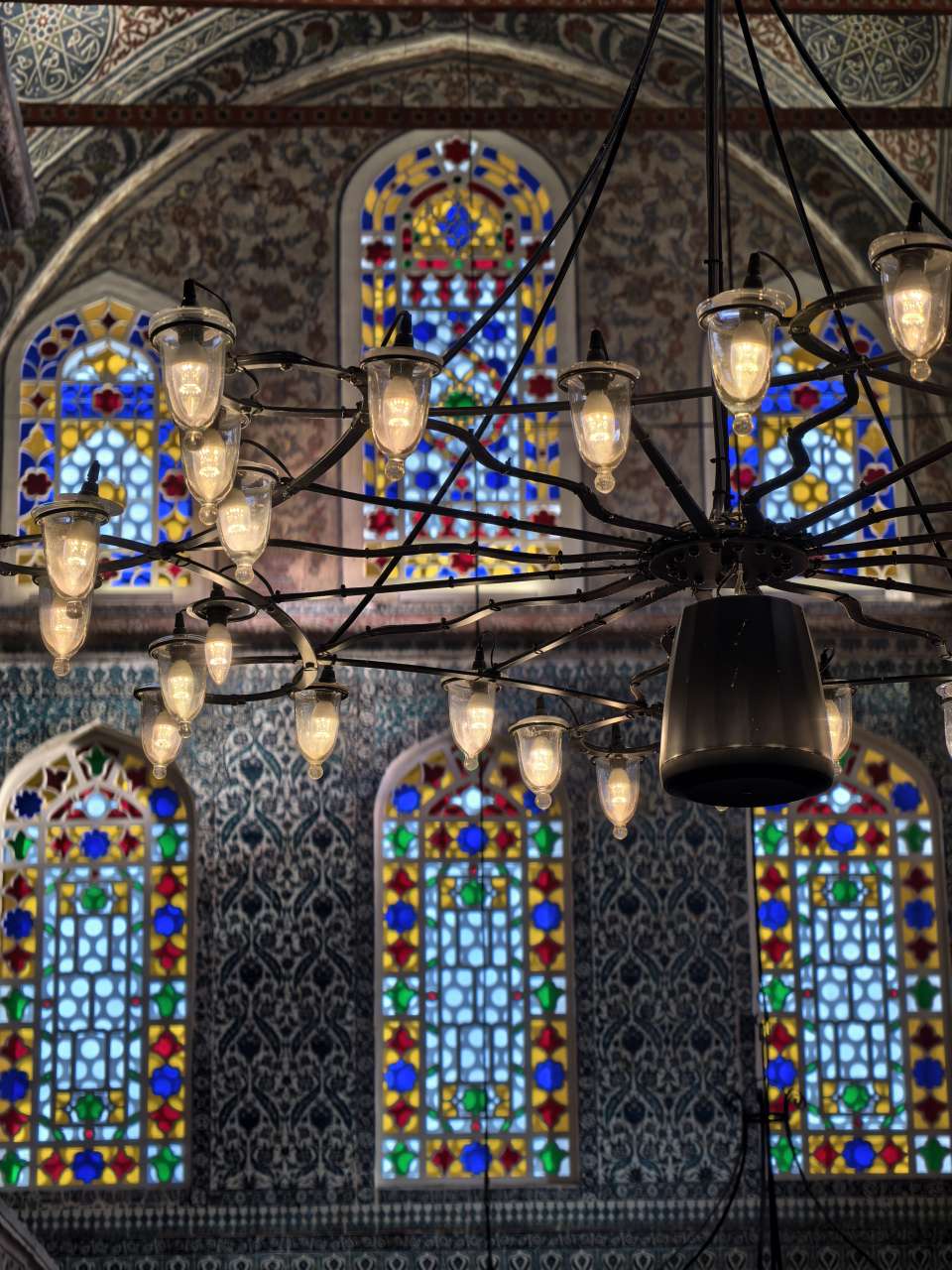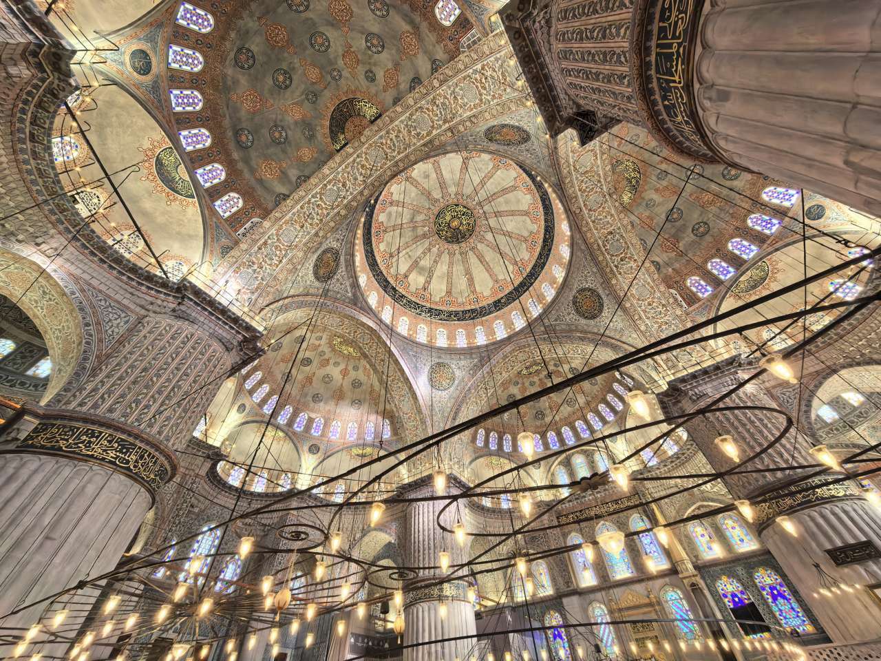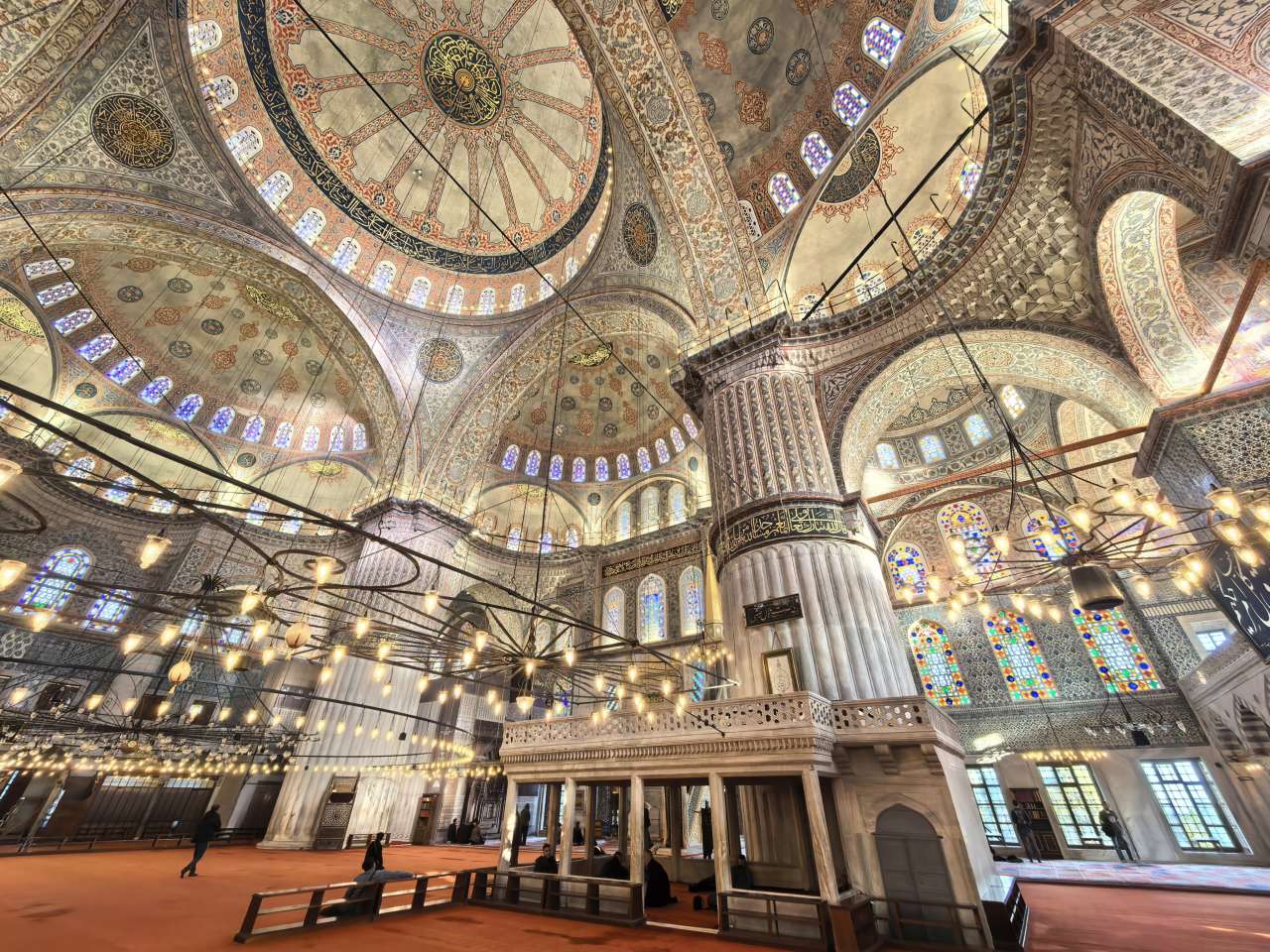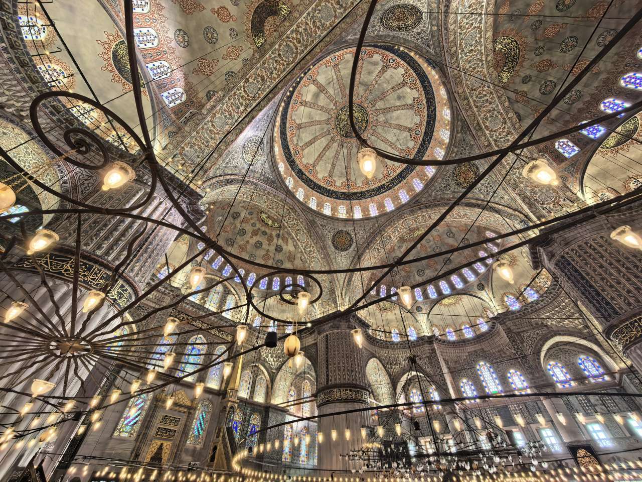 Toată agitația și zumzetul de afară au dispărut ca prin farmec, deși aglomerația stăruia la interior, cel puțin în zona turistică accesibilă. Am pășit pe covoarele groase și moi, desculț, și am privit la coloanele masive, la candelabrele suspendate care coborau foarte aproape de planul podelei, dar destul de sus încât să nu-i deranjeze pe eventualii baschetbaliști ce ar fi intrat acolo, la superbele decorațiuni care încântă pe oricine, din orice cultă religioasă ar face parte, lalele, garoafe și arabescuri în nuanțe de cobalt, turcoaz, albastru și de alb, de o finețe de nedescris.