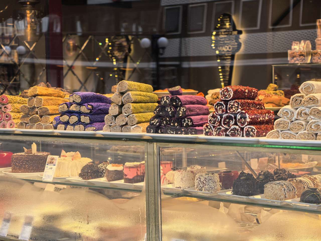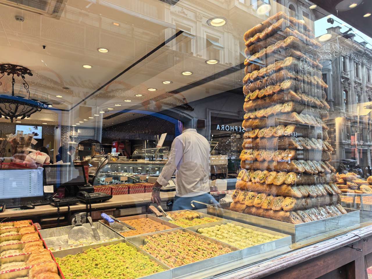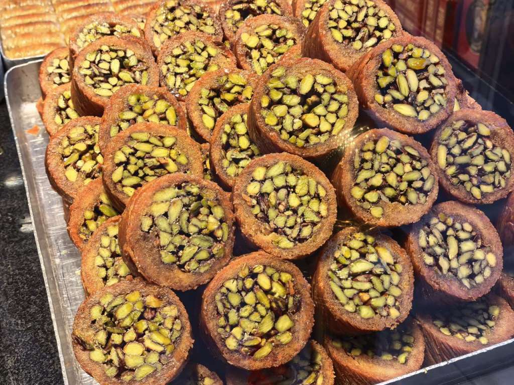 A fost nostim la Hafiz Mustafa, unde mi-a făcut cu ochiul un fel de kataif cu mult fistic la interior, ca un fel de plăcintă cu brânză de-a noastră, doar că în loc de foi sunt două straturi grosuțe de kataif, iar în loc de brânză… bucățele de fistic. L-am rugat pe vânzător să îmi dea plăcințica într-o hârtie, să o mănânc pe drum, omul a înțeles „to go”, mi-a ambalat-o frumos ca pe o bijuterie inestimabilă într-o cutiuță roșie și mi-a dat drumul pe ușă.