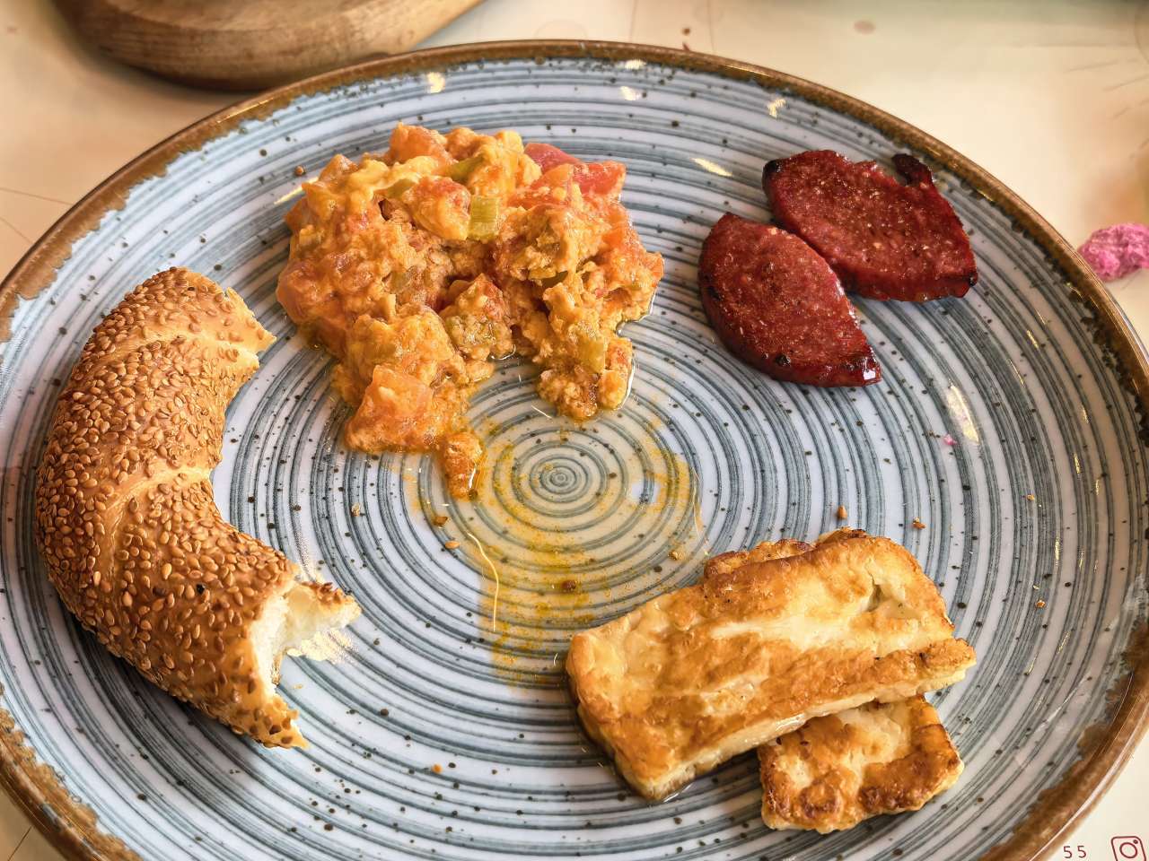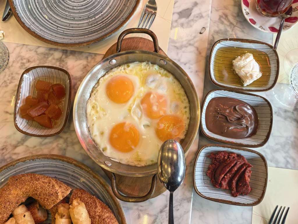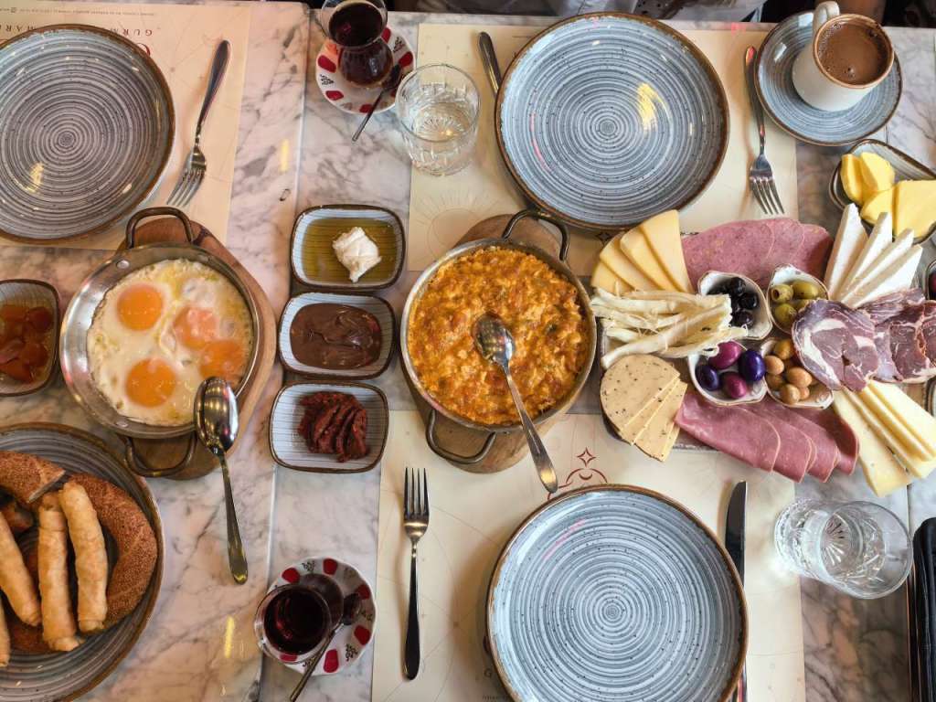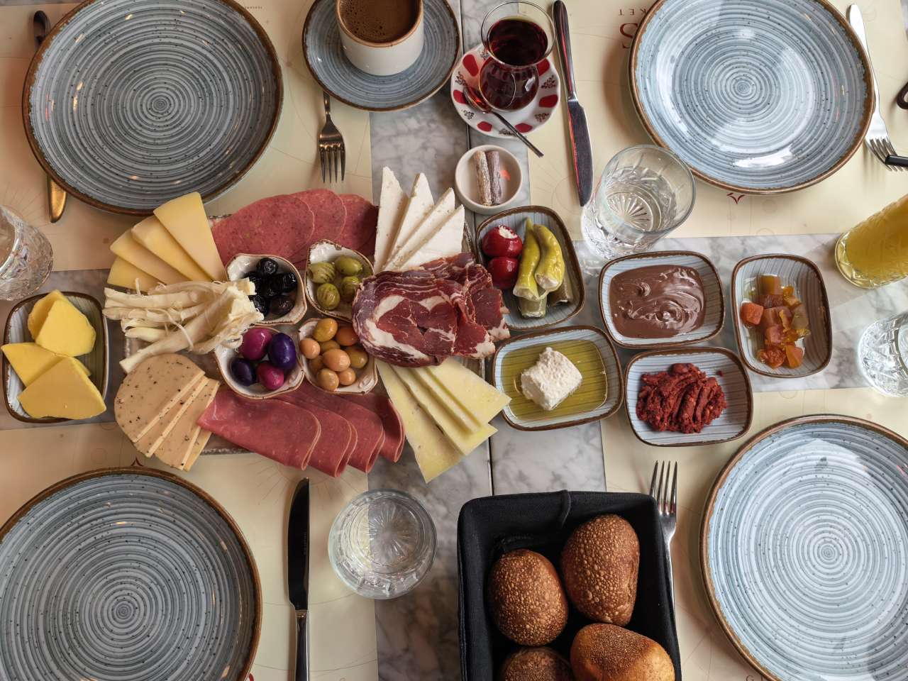 Mic dejun mai bogat ca acesta, nu cred să fi văzut vreodată. Ouă ochiuri, menemen, omletă tradițională turcească cu roșii și condimente, varietate de brânzeturi și mezeluri, măsline, pâine caldă și crocantă, simit, crochete cu brânză, miere cu caimac, dulceață de piersici confiate, cremă de ciocolată, salam prăjit, brânză pe grătar, cartofi prăjiți, legume proaspăt tăiate… de lângă care nu au lipsit ceaiul într-un pahar cu formă de lalea și cafeaua turcească.