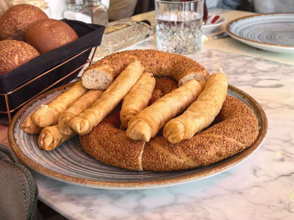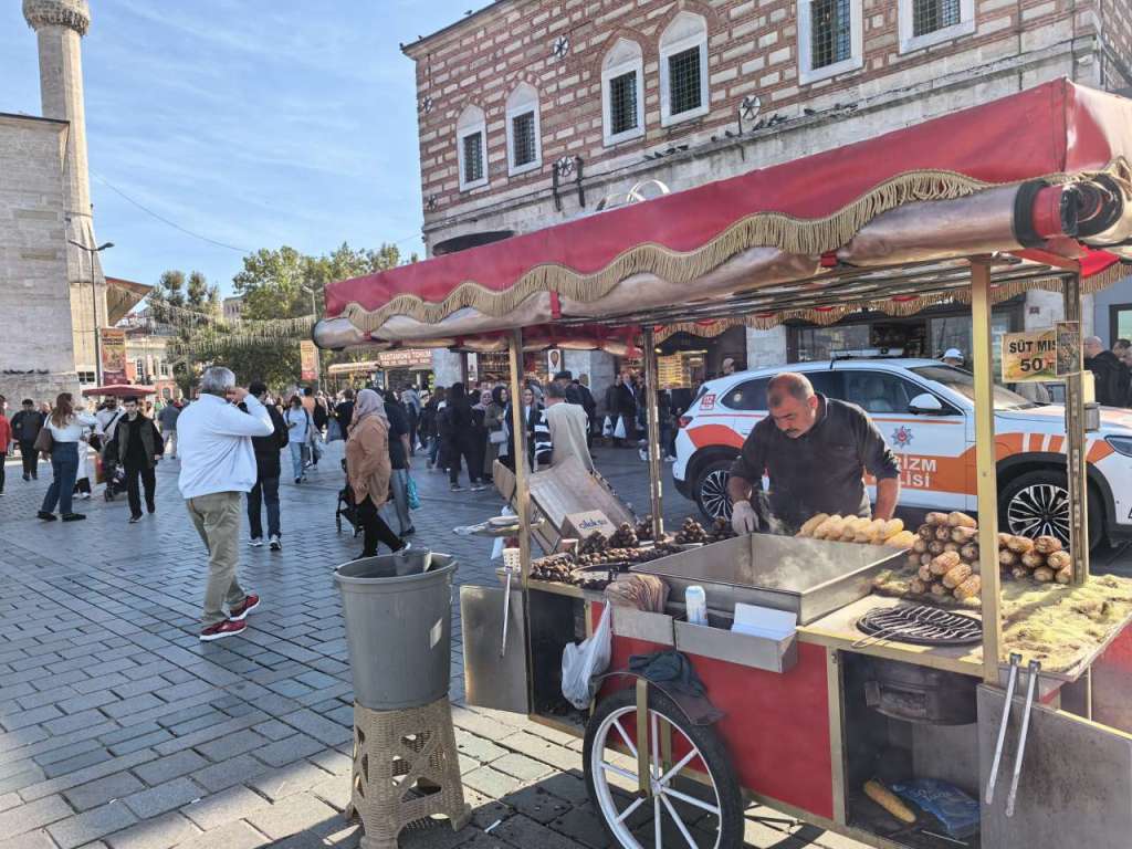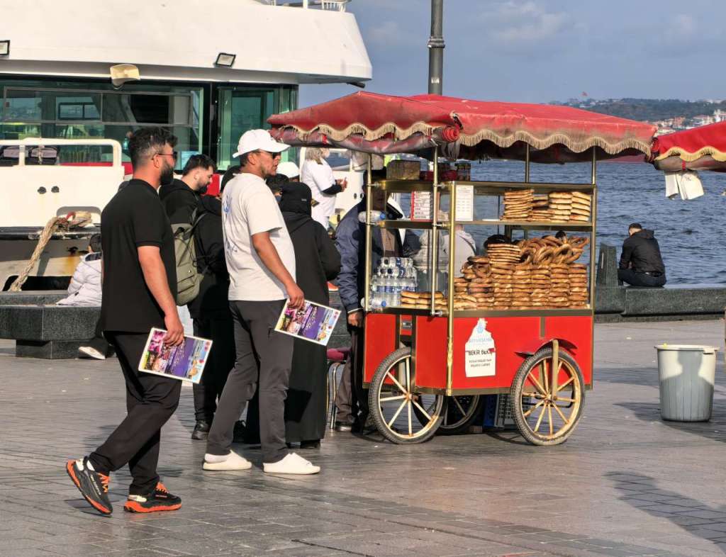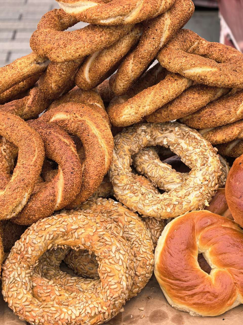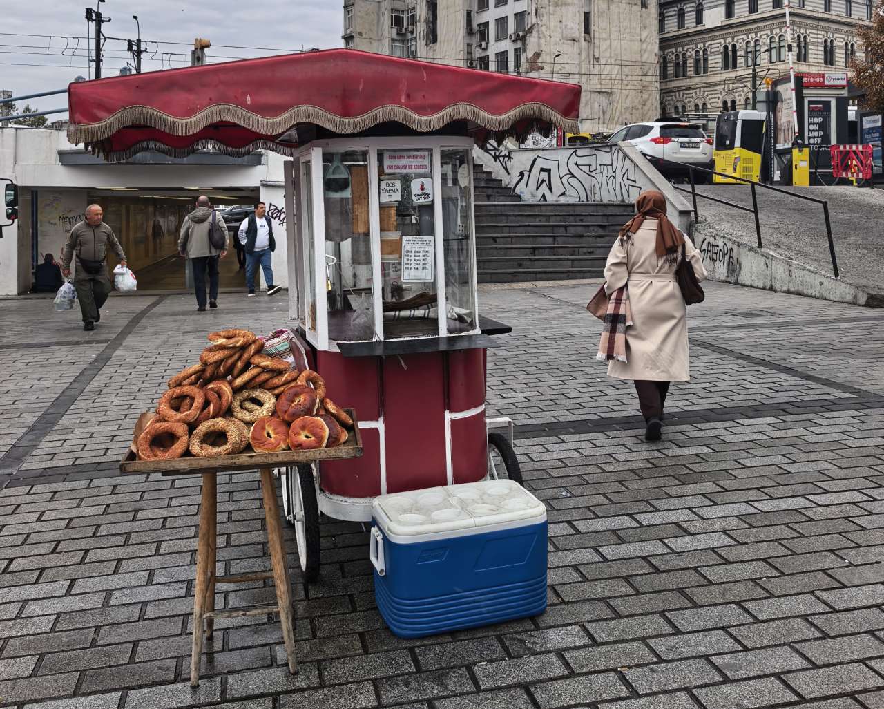 Dacă ți-e un pic fomică, sau doar poftă, peste tot găsești vestitele tarabe roșii, care vând simit, covrigul auriu cu susan, la un preț de aproximativ 2.2 Lei, crocant la exterior și moale la interior.