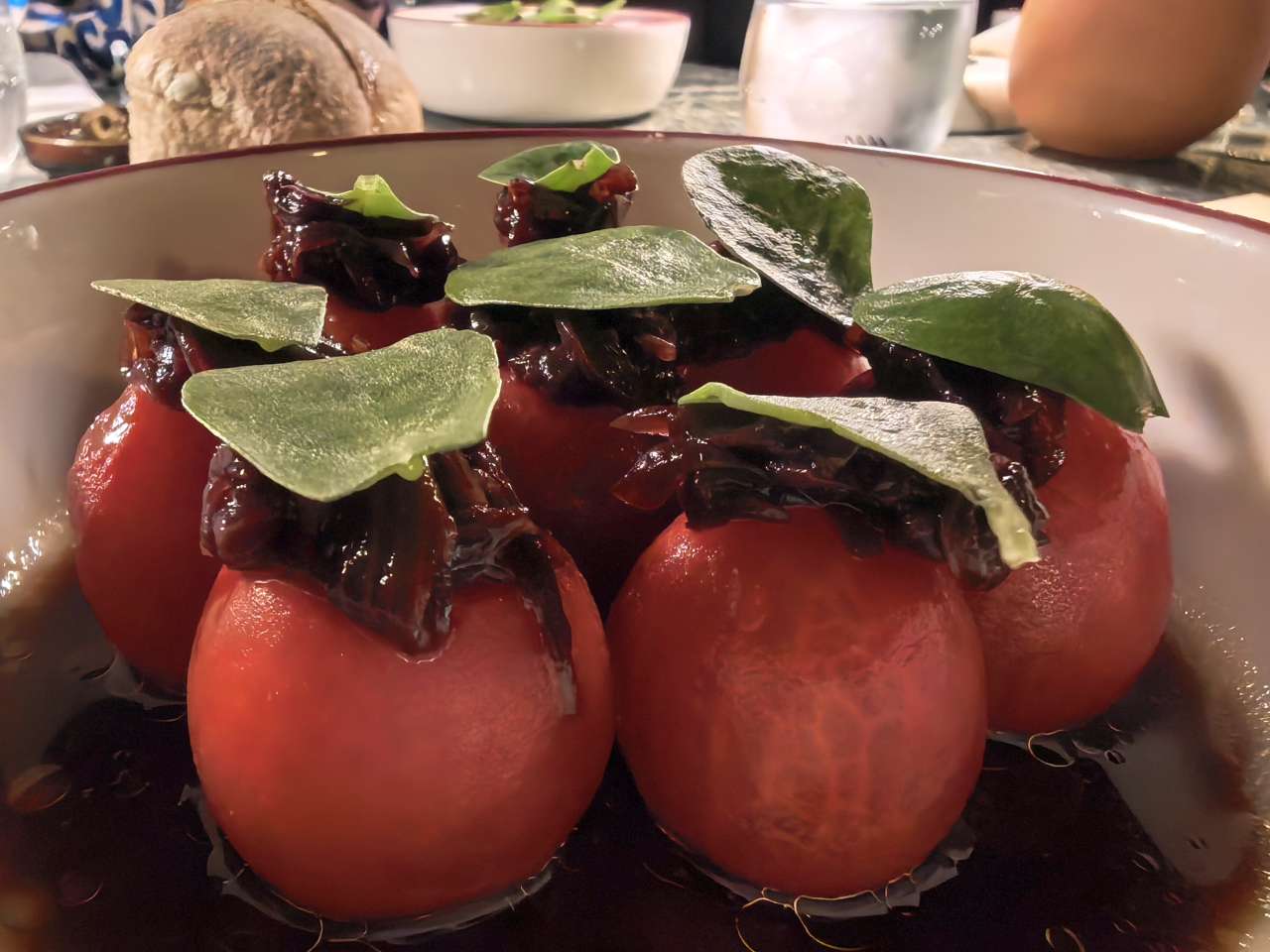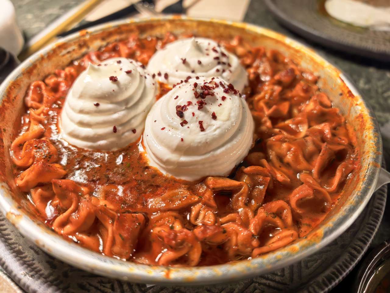 Meze-uri calde, sicak meze cred se numesc în limba turcă, un fel de colțunași umpluți cu carne, peste o porție sănătoasă de iaurt, paste tradiționale turcești, cum le făcea bunica sau cum le gătesc bunicile și acum în Turcia, cu caimac și iaurt din belșug, ca un dans între Italia și Anatolia, tapsi manti cred că le zice, salată ca la Istanbul din roșii dezgolite, ceapă roșie, peste care s-a turnat un sos Koruk, fresh, obținut din struguri necopți, rafinat și plin de savoare…