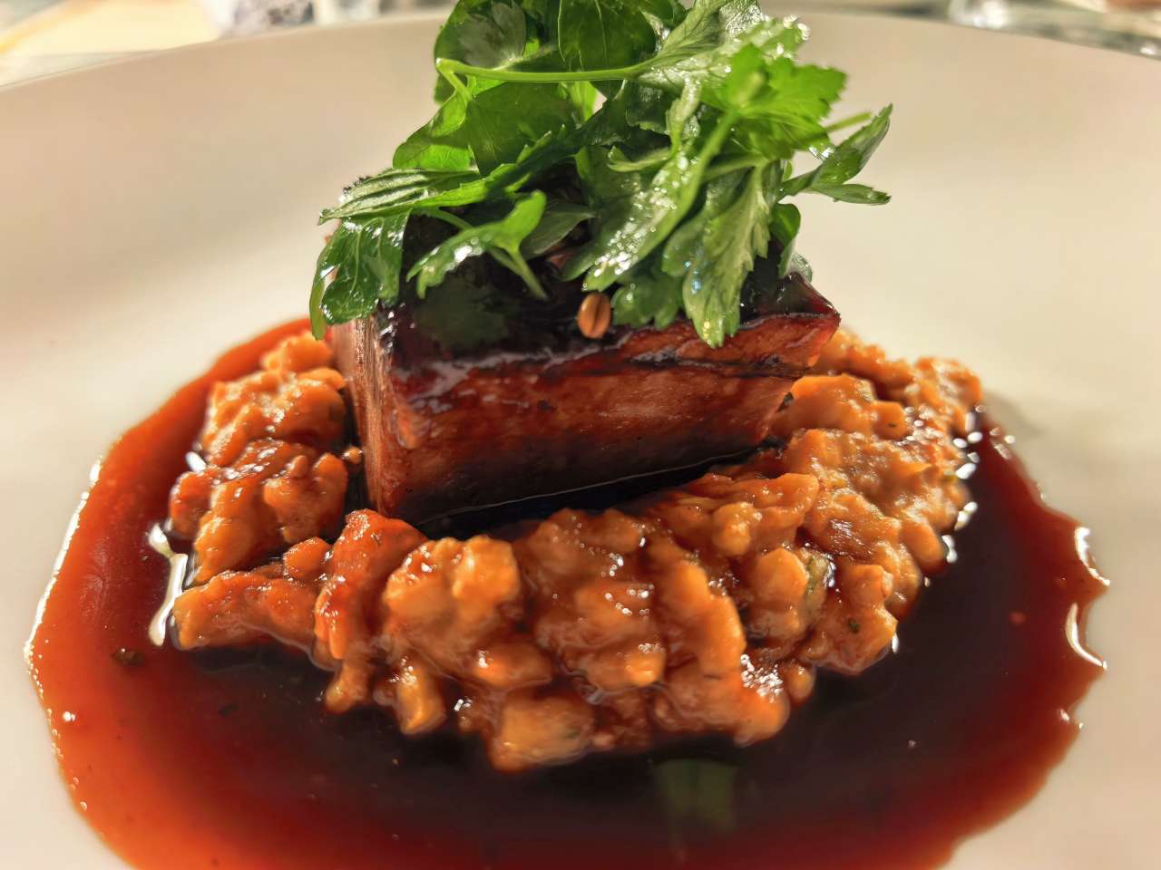 … o coastă de vită gătită nu mai puțin de 16 ore peste un pat de garnitură dintr-un fel de arpacaș din grâu, cum la noi n-am mâncat niciodată, pentru că asociem în general cu dulce acest ingredient…