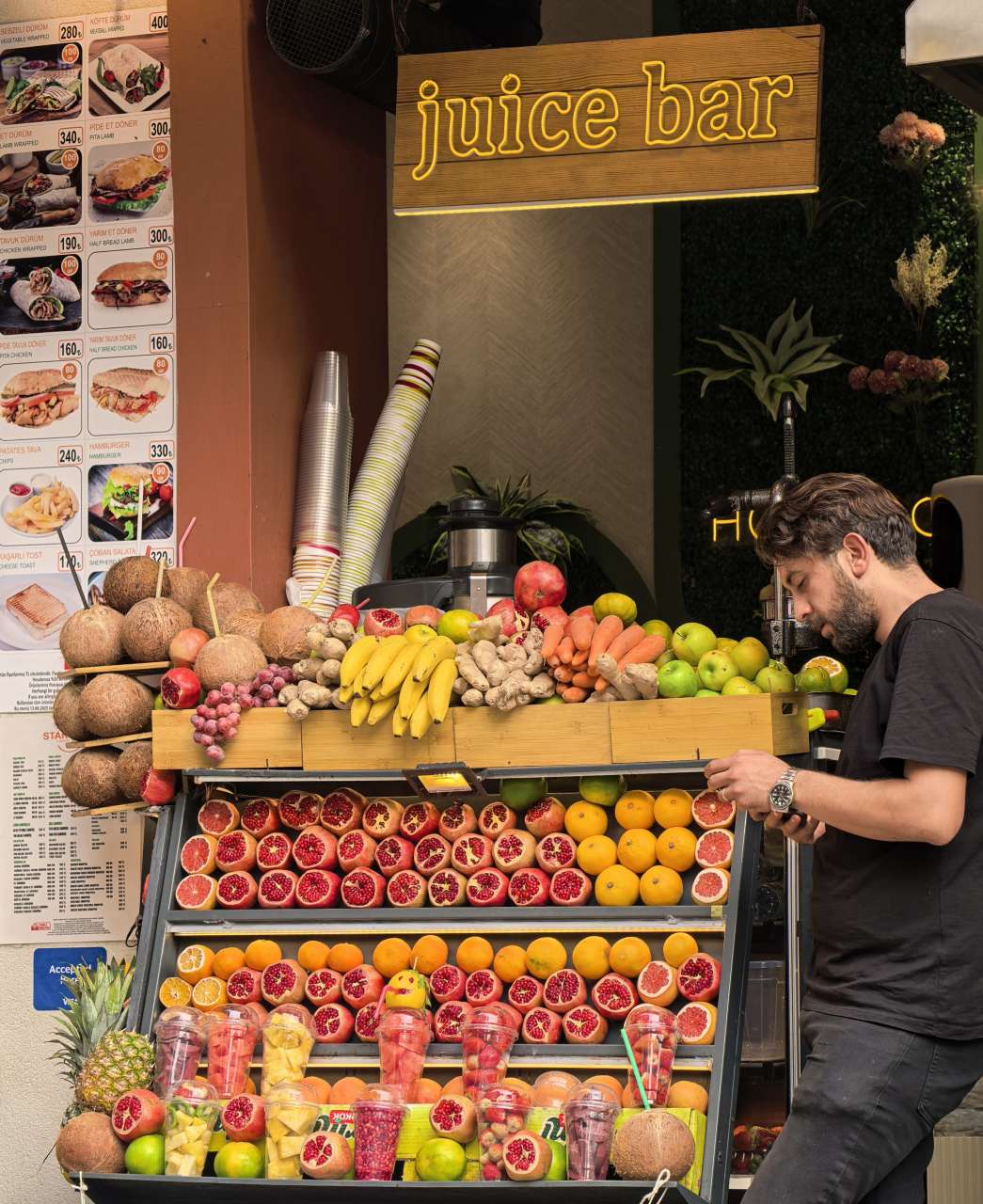 Iar dacă te apucă setea prin oraș și ai poftă de un suc natural proaspăt, nu va trebui să cauți prea mult o „sucărie”. Cu sucuri proaspte și răcoritoare din rodie, portocale, ba chiar și din morcovi sau mere.