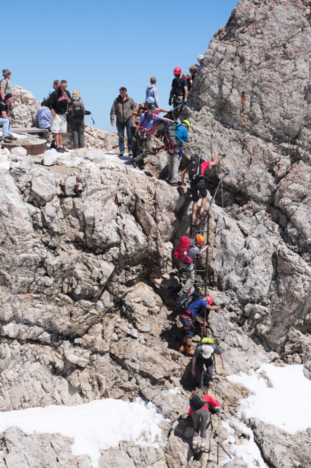 Ajungem in gara de pe platoul Zugspitze – Zugspitzplatt, dupa care ne indreptam catre telecabina. Nu ne urcam in telecabina care ne va duce pe varful Zugspitze (2964 metri) pana nu degustam o bere rece sau pana nu facem cateva fotografii cu familia, aici, pe platou. Apoi, dupa 5 minutzele cu telecabina, suntem pe cel mai inalt varf al Germaniei. Aici, parca suntem pe o statie lunara. Cu restaurante, cu magazine de suveniruri, un mic muzeu, cu de toate. Nu mai spun ca putem trece granita, chiar pe varf, si in Austria. Totul este pus la dispozitie pentru distractia turistului. Dupa vreo doua ceasuri si cateva beri, wursti sau strudele de mere, dupa ce am admirat, fotografiat si filmat indeajuns peisajul maestru care ni se arata, va puteti intoarce ori pe unde ati venit, ori cu alta telecabina, pana jos la Eibsee. De acolo, trenul va aduce inapoi in Garmisch. Ce ziceti? Merita banutul? Cu varf si indesat, as zice eu.